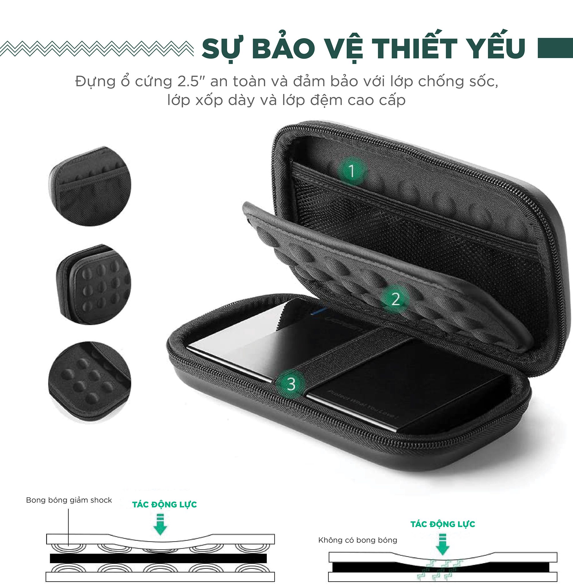 • Chống sốc: Lớp lót dày dặn bên trong giúp giảm thiểu tác động từ va đập, bảo vệ phụ kiện khỏi hư hỏng.